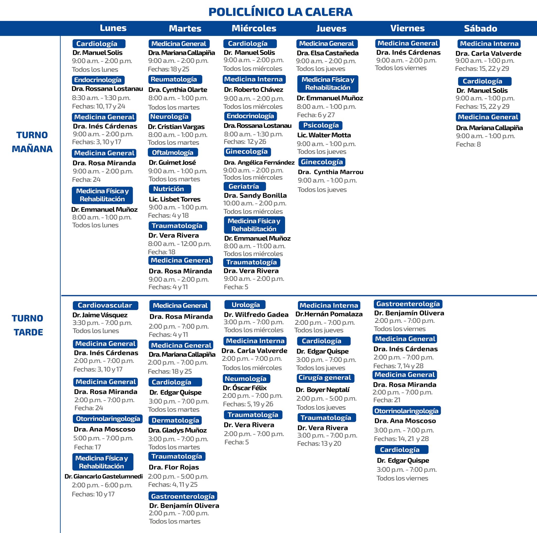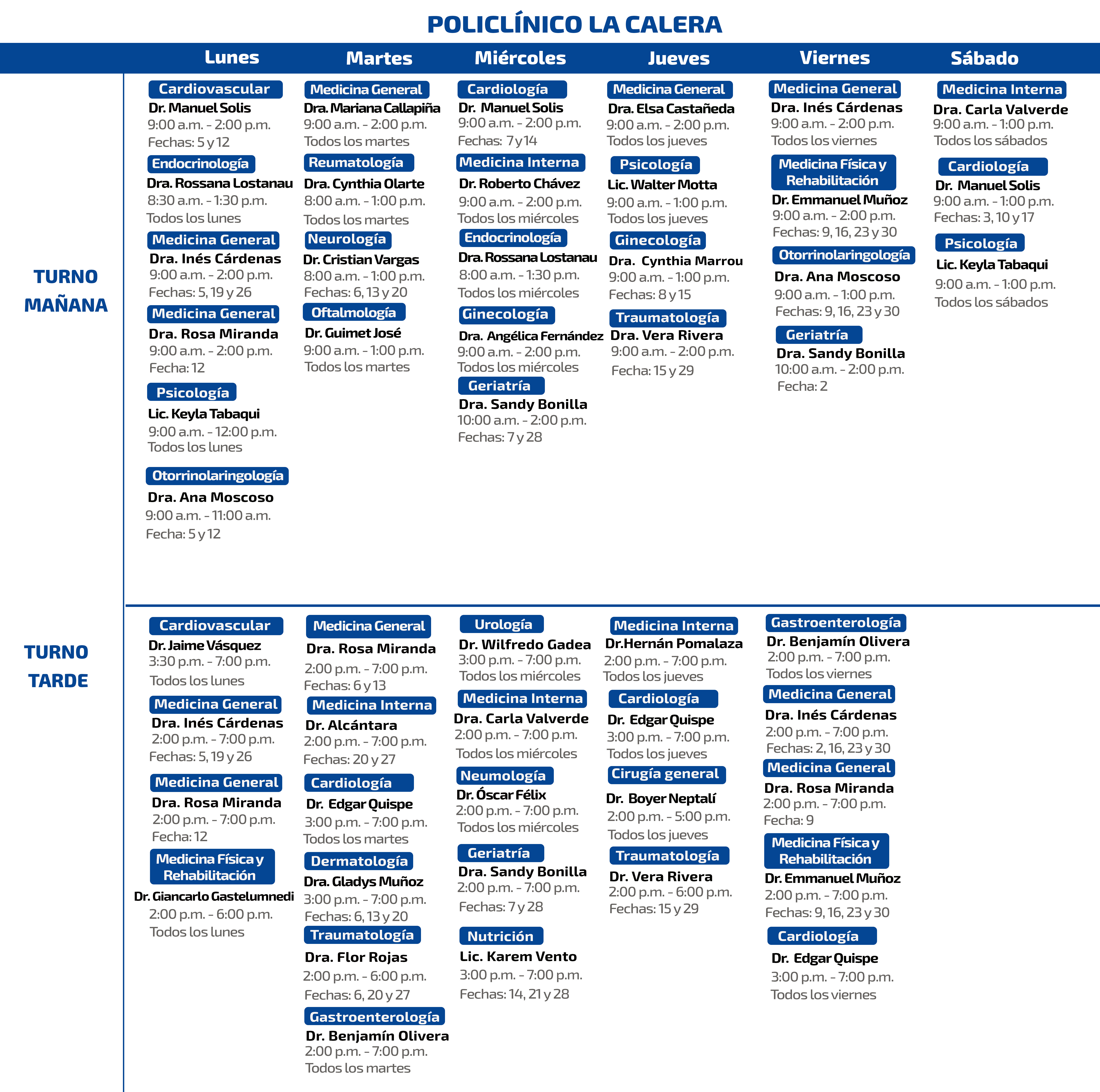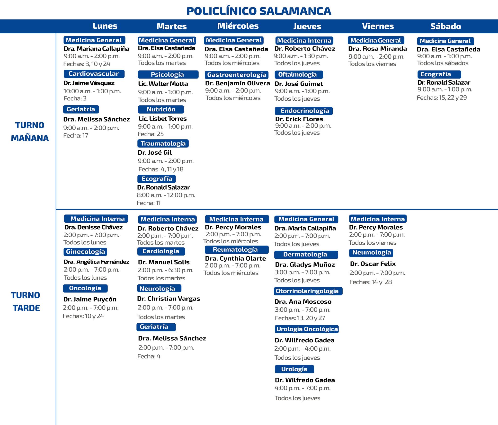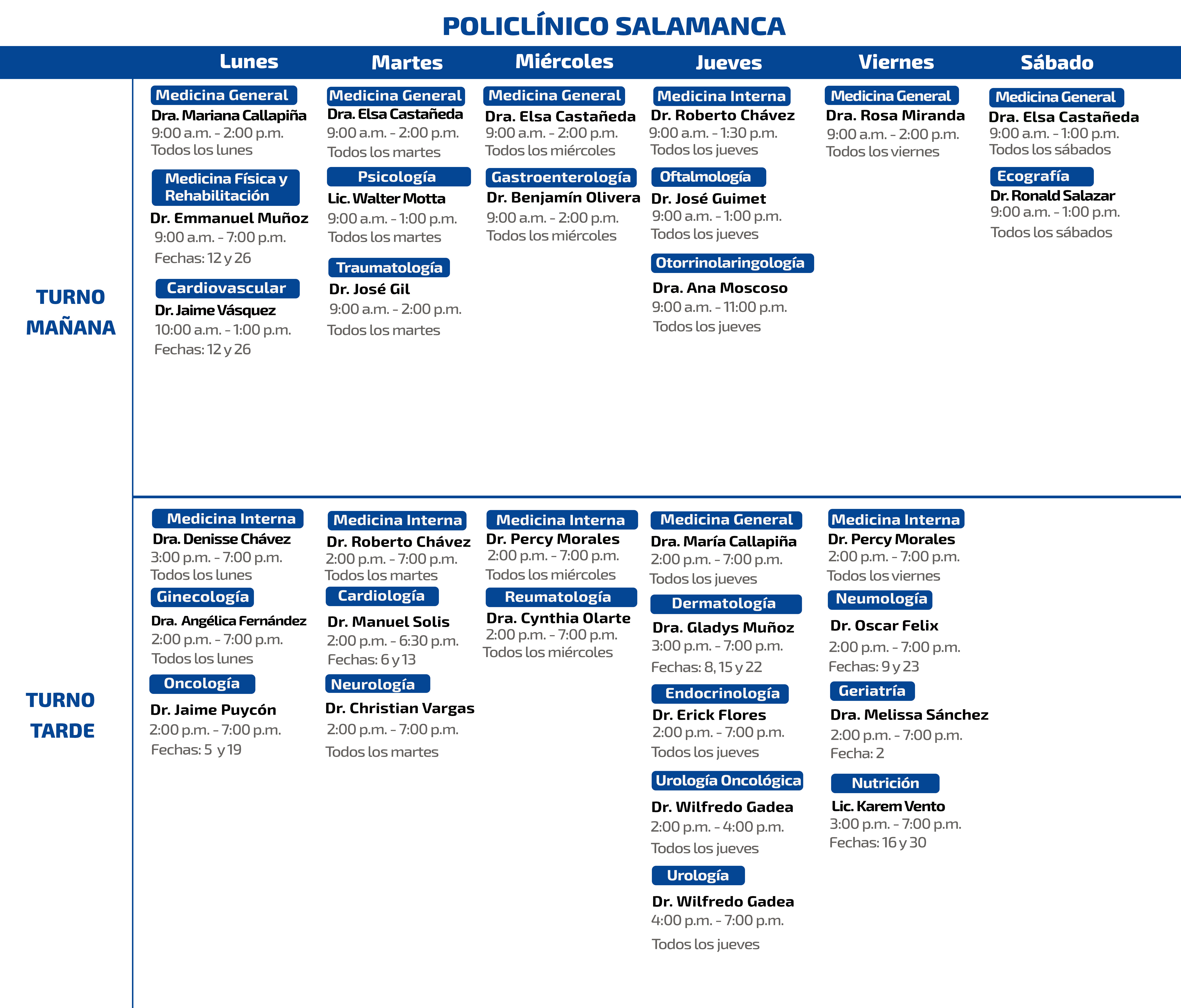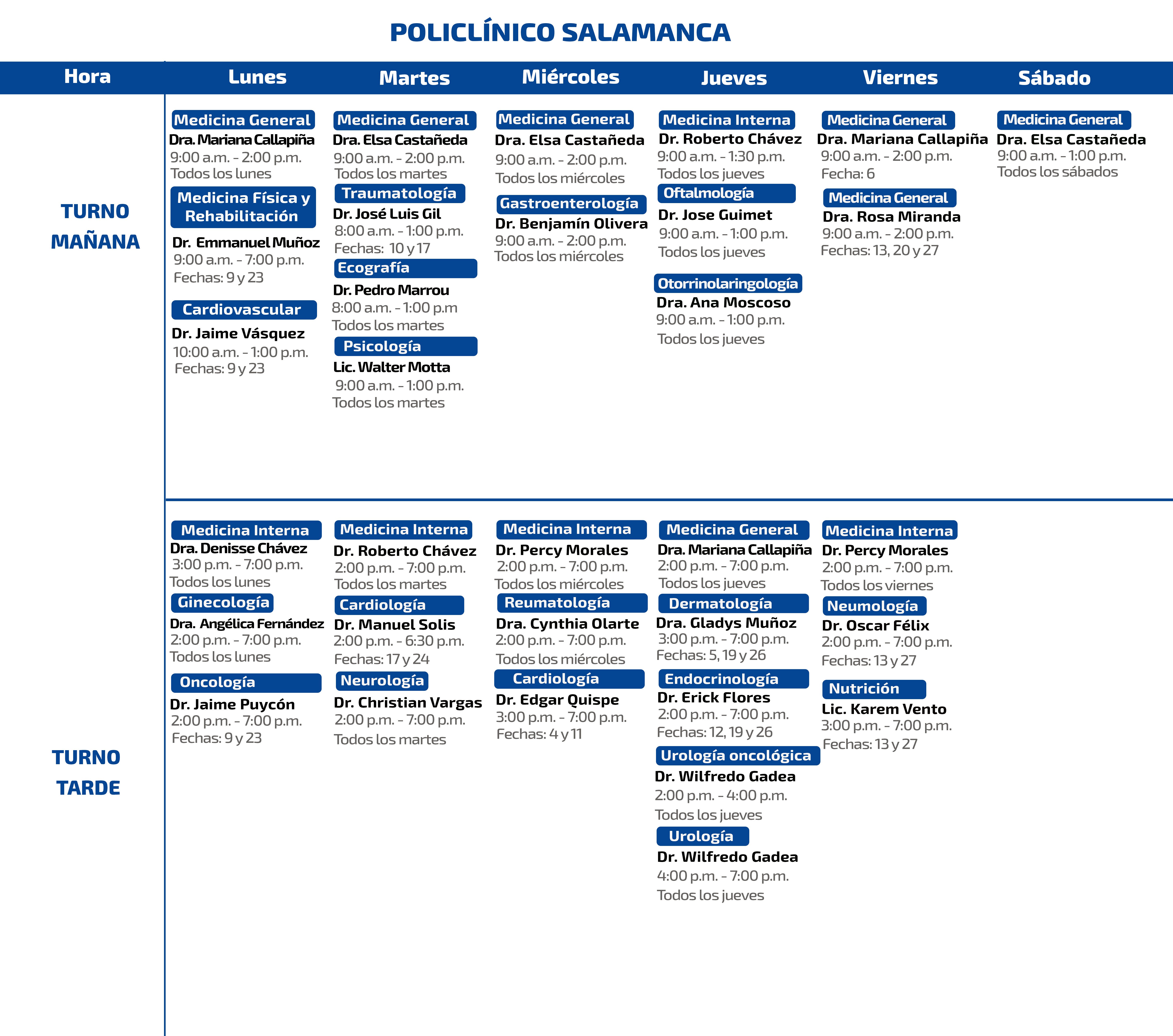 Contamos con tres policlínicos, ubicados en los distritos de: Salamanca, La Calera y Lima, ofreciendo un servicio integral de salud para nuestros afiliados y para la comunidad en general.
